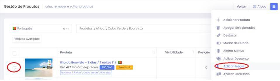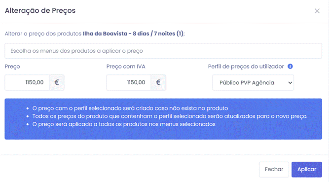 Nota: se quiser aplicar o novo preço indicativo a todos os pacotes num menu destino, podem tambem fazer aqui neste quadro, selecionando o menu destinona caixa ‘Escolha os menus dos produtos a aplicar preço’