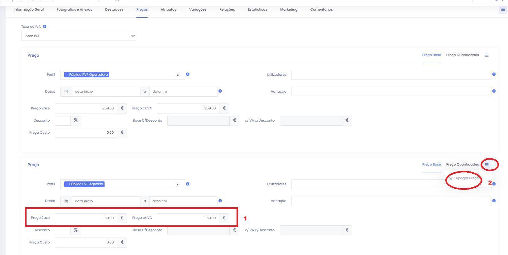5-Para alterar o preço indicativo ou eliminar, basta entrar na ficha do pacote e no tabulador Preços altera o preço de perfil ‘Publico PVP Agência‘ nos 2 campos assinalados a vermelho (1 da imagem abaixo) e grava.