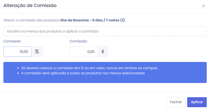 Nota: se quiser aplicar a comissão a todos os pacotes num menu destino, podem tambem fazer aqui neste quadro, selecionando o menu destinona caixa ‘Escolha os menus dos produtos a aplicar comissão