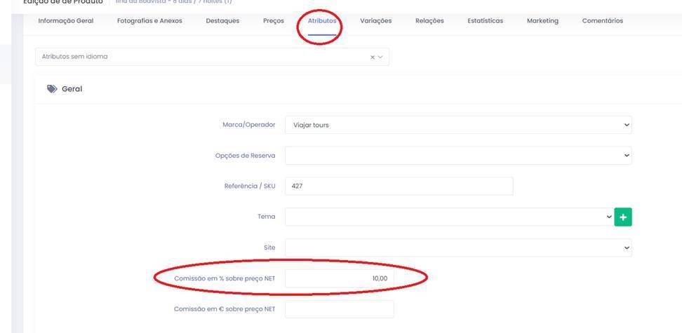4-Para alterar a comissão pode entrar na ficha do pacote e no tabulador ‘ATRIBUTOS’, no campo assinaldo a vermelho altera o vaor em percentagem ou no campo seguinte em numerario.