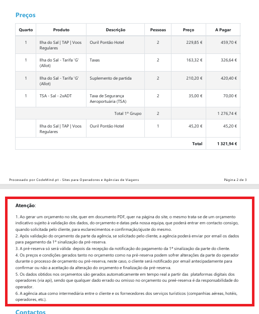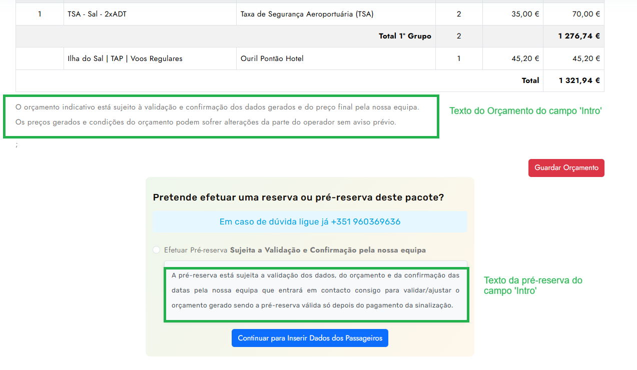 -Para alterar os textos que aparecem no orçamento, pré-reserva no site, basta na gestão de conteúdos editar o campo 'Intro' e gravar.