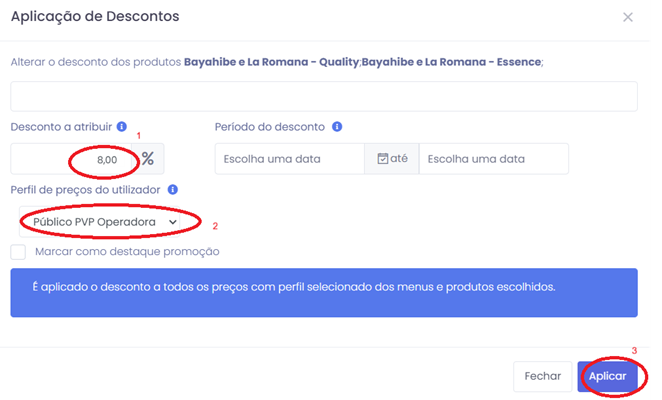 2 - Em seguida, insira o desconto percentual, selecione o perfil 'Publico PVP Operadora' e clique no botão 'Aplicar'.
