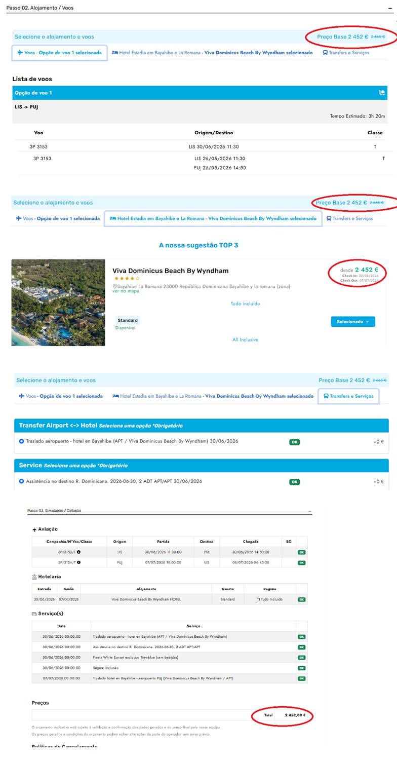 A comissão da agência não incide em nenhum momento nos valores intermédios obtidos durante a seleção de voos, alojamento e serviços.